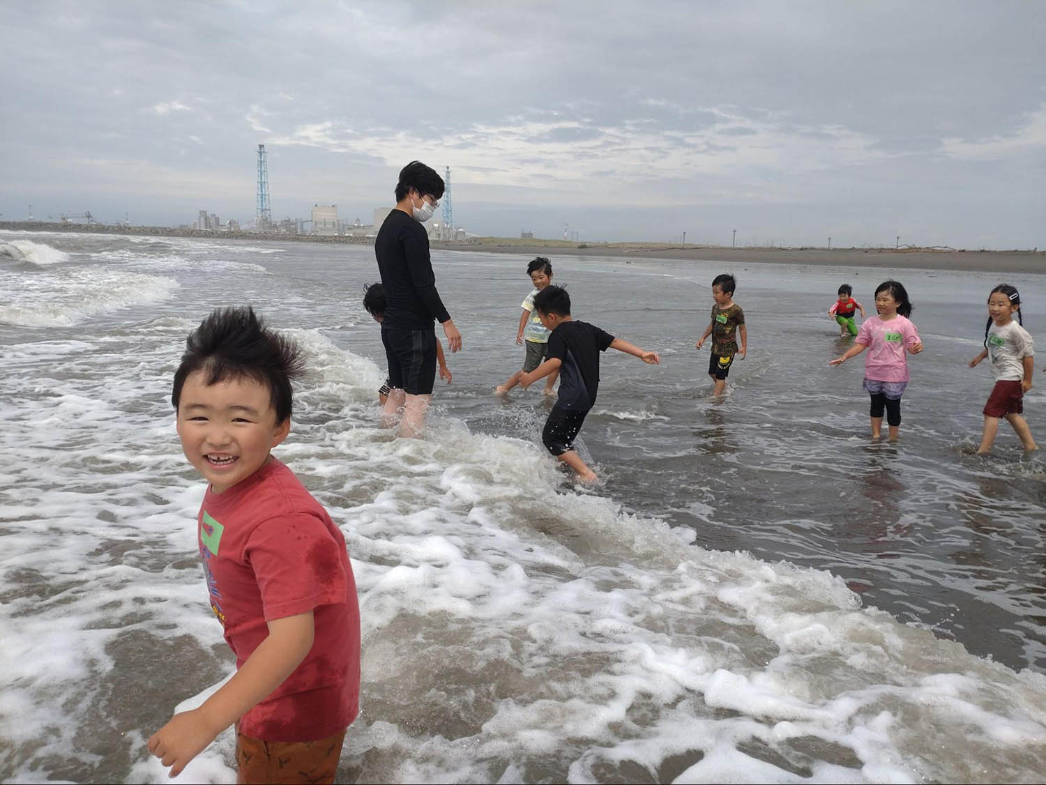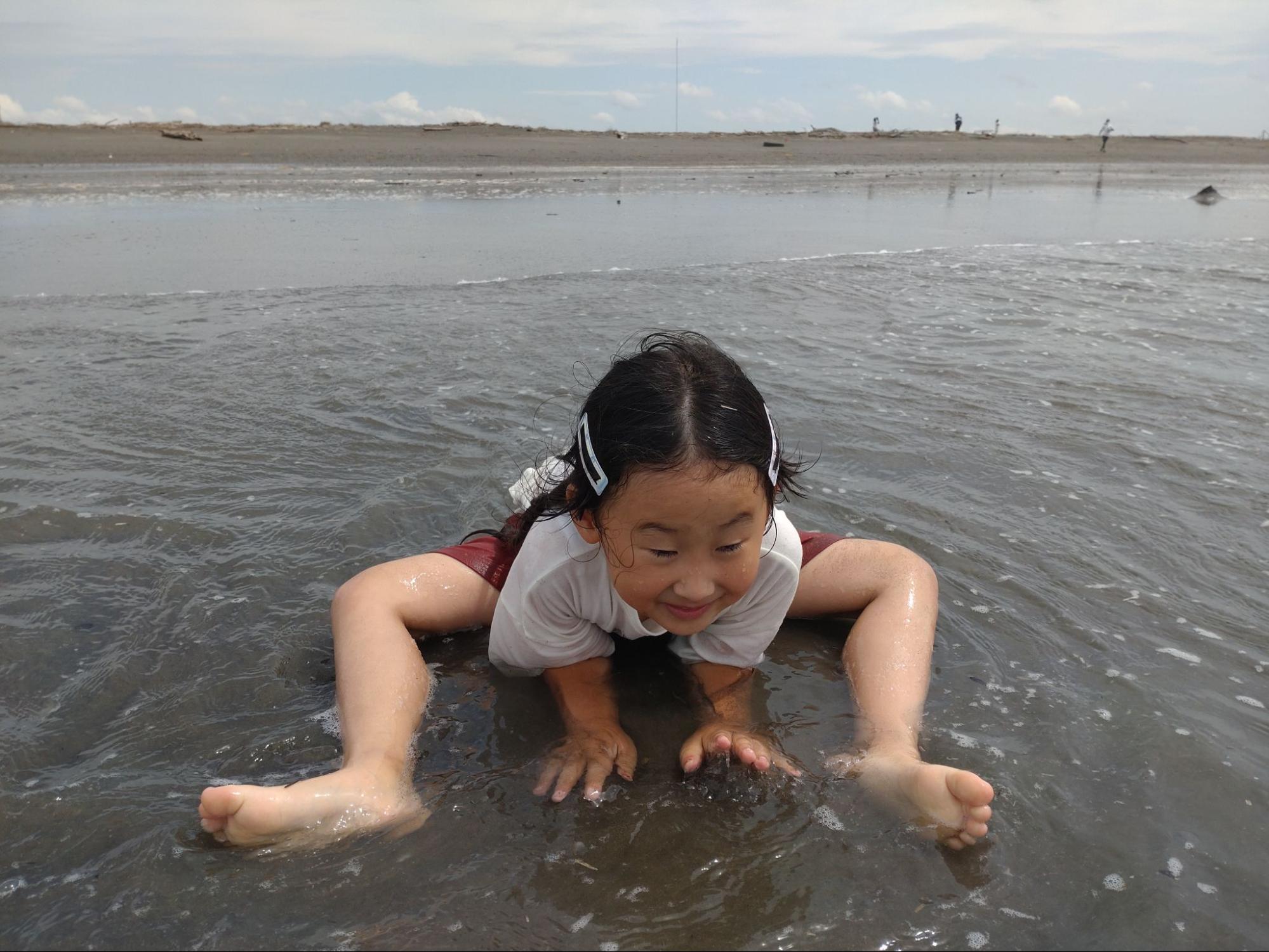 浜厚真の海辺で、波と追いかけっこしたりホッキ貝の殻を拾ったり。